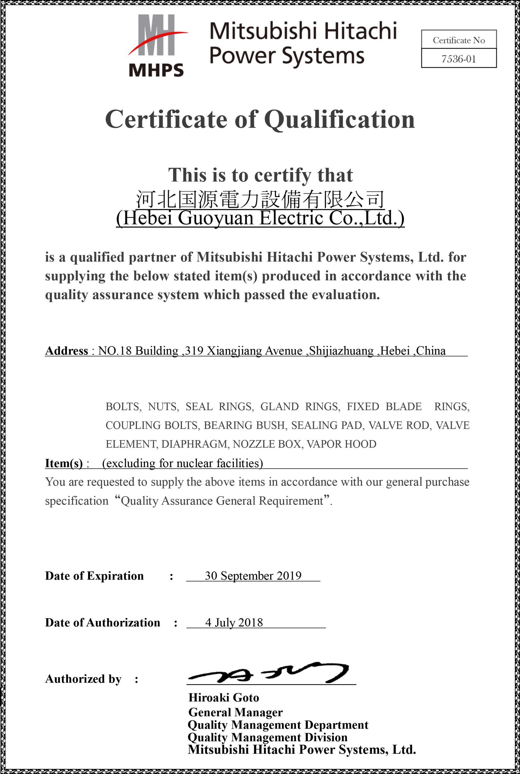三菱日立電力系統(tǒng)合格供方證書 2018-09-29