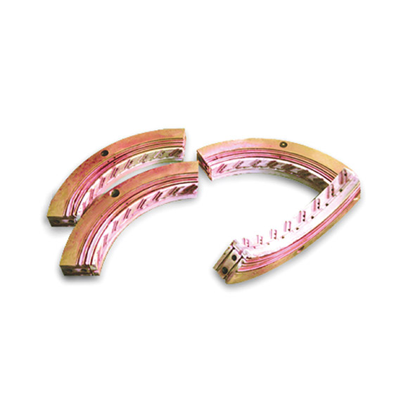 東汽較新的機(jī)組多采用該形式密封瓦,結(jié) 構(gòu)簡(jiǎn)單,加工容易,但在檢修時(shí)必須有專(zhuān) 用的工裝。